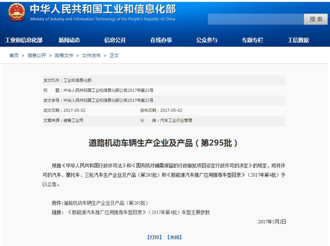 根據《中華人民共和國行政許可法》和《國務院對確需保留的行政審批項目設定行政許可的決定》的規定,現將許可的汽車、摩托車、三輪汽車生產企業及產品(第295批)和《新能源汽車推廣應用推薦車型目錄》(2017年第4批)予以公告。