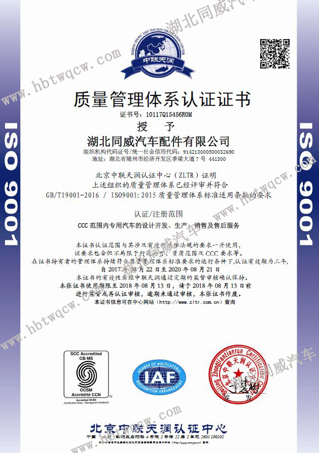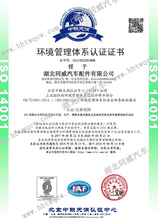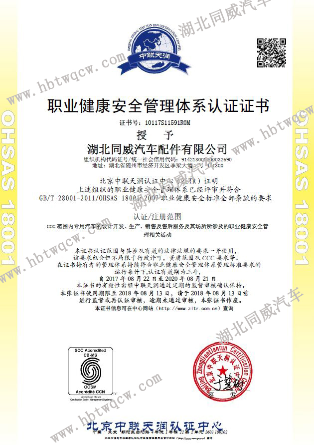湖北同威汽車配件有限公司通過9001管理體系認證,其中包括職業健康安全管理體系認證證書,質量體系管理認證證書,環境管理體系認證證書。