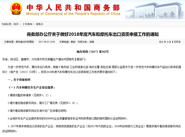 商務(wù)部辦公廳關(guān)于做好2018年度汽車和摩托車出口資質(zhì)申報工作的通知