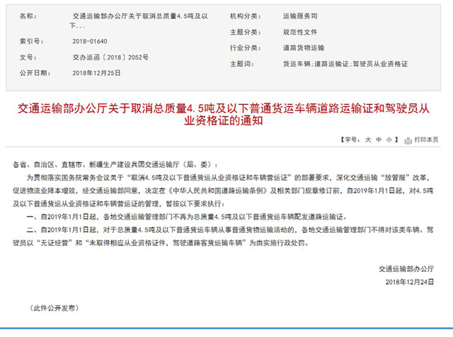 為貫徹落實(shí)國務(wù)院常務(wù)會(huì)議關(guān)于“取消4.5噸及以下普通貨運(yùn)從業(yè)資格證和車輛營運(yùn)證”的部署要求,深化交通運(yùn)輸“放管服”改革,促進(jìn)物流業(yè)降本增效,經(jīng)交通運(yùn)輸部同意,決定在《中華人民共和國道路運(yùn)輸條例》及相關(guān)部門規(guī)章修訂前,自2019年1月1日起,對(duì)4.5噸及以下普通貨運(yùn)從業(yè)資格證和車輛營運(yùn)證的管理,暫按以下要求執(zhí)行:
