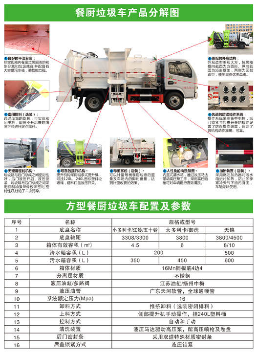 1、該車用于餐廚垃圾收集清運(yùn),主要專用裝置為垃圾桶升降裝置,封閉式垃圾罐等裝置。該車僅選用2800mm和3300mm軸距底盤,外形長(zhǎng)度/軸距對(duì)應(yīng)關(guān)系為(mm):5185/2800,5685/3300。2.側(cè)/后防護(hù)材料為Q235,側(cè)防護(hù)螺栓連接,后防護(hù)焊接,截面尺寸100×50mm,下邊緣離地高400mm。3.ABS生產(chǎn)廠家/型號(hào):威伯科汽車控制系統(tǒng)(中國(guó))有限公司/ABS-E 4S/4M;浙江萬(wàn)安科技股份有限公司/VIE ABS-II;廣州瑞立科密汽車電子股份有限公司/CM4XL-4S/4M;蕪湖伯特利汽車安全系統(tǒng)有限公司/WBTL-ABS。隨底盤選裝駕駛室。 |