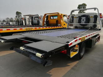 該車平板長度為5.3米(含液壓伸縮加長部份),寬2.22米,3P2A折疊沖壓式平板,帶100CM液壓伸縮式可加長平板。該車采用國標優質碳鋼花紋板制作,平板由多塊壓制預壓板組成,10根加強型槽鋼橫梁固定,既減輕了整車重量,又增加了托舉和裝載能力。 大承載質量為2.5噸,平板 小傾斜角為8度,托舉系統額定托舉質量為1.2噸,采用1個4噸液壓絞盤,加粗鋼絲繩20米,一個工具箱,一個洗手箱,該車配備6個綁帶,鏈鉤一條,可選裝LED長排警燈。