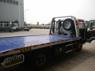 該車平板長度為5.3米(含液壓伸縮加長部份),寬2.22米,3P2A折疊沖壓式平板,帶100CM液壓伸縮式可加長平板。該車采用國標優質碳鋼花紋板制作,平板由多塊壓制預壓板組成,10根加強型槽鋼橫梁固定,既減輕了整車重量,又增加了托舉和裝載能力。 大承載質量為2.5噸,平板 小傾斜角為8度,托舉系統額定托舉質量為1.2噸,采用1個4噸液壓絞盤,加粗鋼絲繩20米,一個工具箱,一個洗手箱,該車配備6個綁帶,鏈鉤一條,可選裝LED長排警燈。