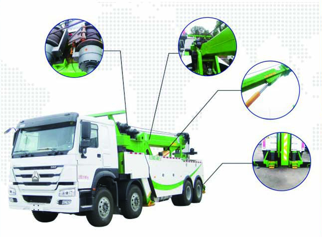 1.托舉功能:托舉功能是是重型清障車的應有的功能,就是利用托臂的伸縮、提升、帶載折疊等動作,將損壞的車輛從前部或后部托起,然后將整車拖離現場。清障車的托架有多種結構形式,一般能托舉事故車的車軸、車輪、鋼板彈簧、車架等,裝拆方便。