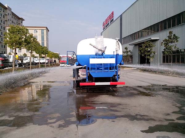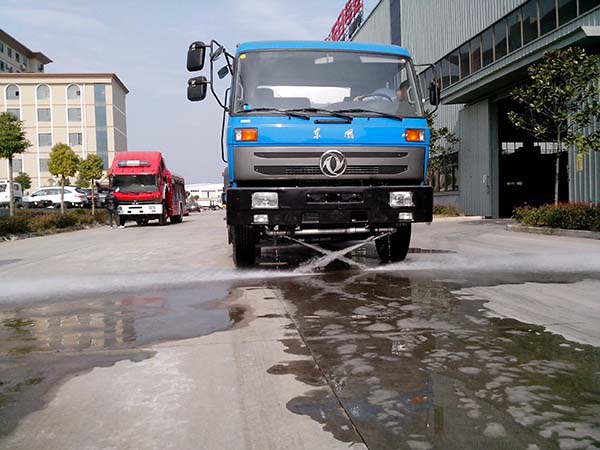 灑水車(chē)前裝有鴨嘴形噴嘴或圓錐形沖嘴,后面裝有圓柱形灑水噴嘴或蓮蓬頭噴嘴,后部有工作平臺(tái),裝配有水炮。后部還可裝8個(gè)噴嘴。