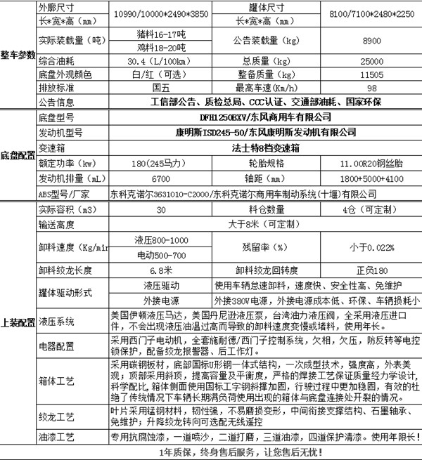 | 罐體外形尺寸:8000×2450×2250(mm),罐體有效容積:27.93立方米隨底盤選裝駕駛室;外形長(mm)/軸距(mm)/后懸(mm)/離去角(°)對應關系為”:10990/1800+5000/2760/11,10000/1800+4100/2670/12;防護材料:Q235,連接方式:側后防護均采用焊接連接,后部防護斷面尺寸(mm):120×60,后部防護離地高度(mm):450。安裝帶衛星定位功能的行駛記錄儀。ABS生產廠家:東科克諾爾商用車制動系統(十堰)有限公司;型號:3631010-C2000.;發動機與油耗值的對應關系分別為:ISD210 50/33.7(L/100Km),ISD245 50/33.6(L/100Km),ISD210 50/33.7(L/100Km),ISD270 50/33.6(L/100Km),ISD285 50/33.5(L/100Km)。該車專用裝置為絞龍,飼料倉,用于運輸散裝飼料,自卸方式:絞龍提升自卸。選裝后部樣式。 |