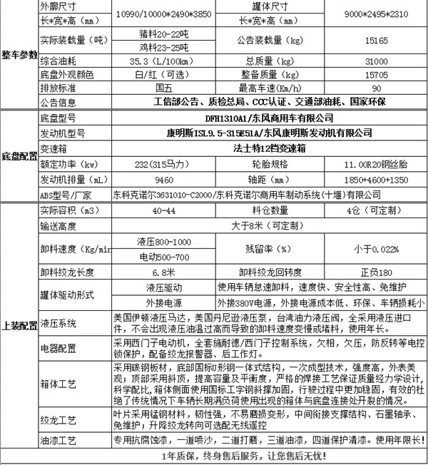 溫馨提示:生產(chǎn)周期為20個(gè)工作日 購車服務(wù)咨詢電話:13277608333 上裝配置: 箱體容積40立方米,分四倉,可同時(shí)裝不同飼料,箱體尺寸:9000*2495*2310mm,電動(dòng)絞龍采用西門子電機(jī)、德力西電器/液壓絞龍采用美國進(jìn)口雙聯(lián)液壓泵、液壓馬達(dá)、液壓控制閥。卸料速度為電動(dòng)600kg/min/液壓1000kg/min,卸料高度≥8m(標(biāo)配8米,可定制),殘留率≤0.022%,專用抗腐蝕油漆,一道噴砂,二道打磨,三道油漆。