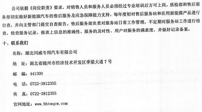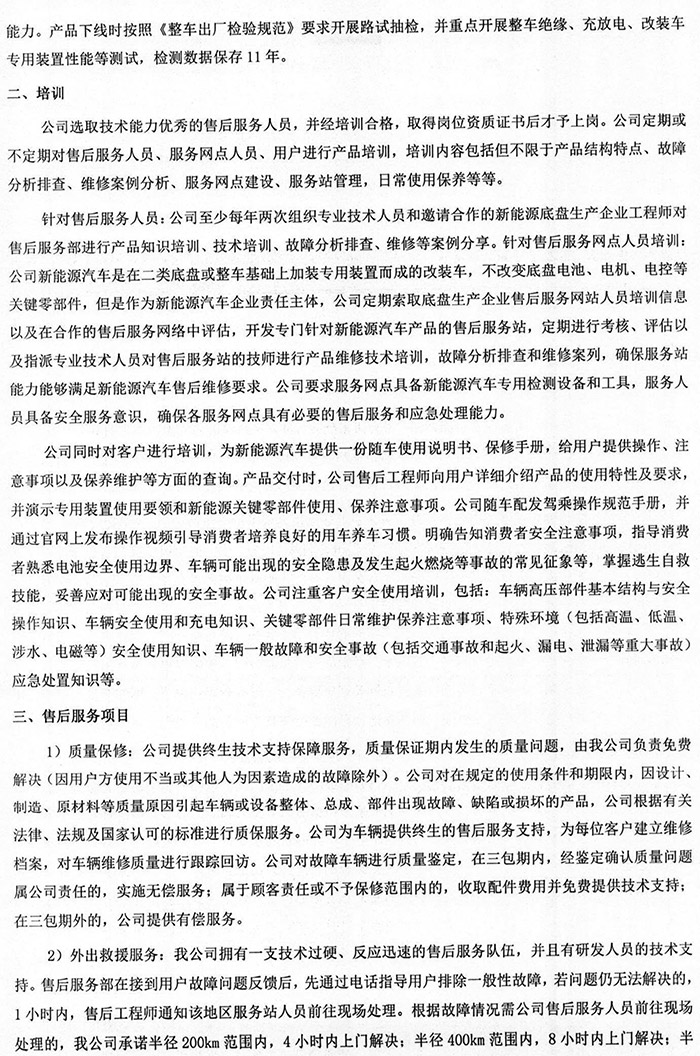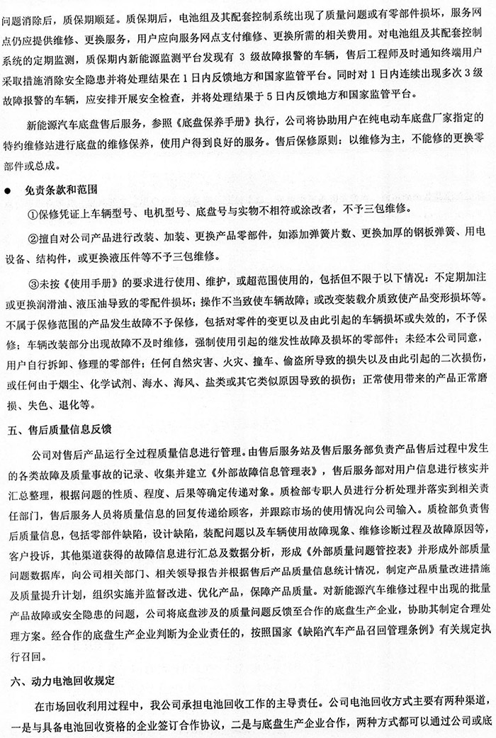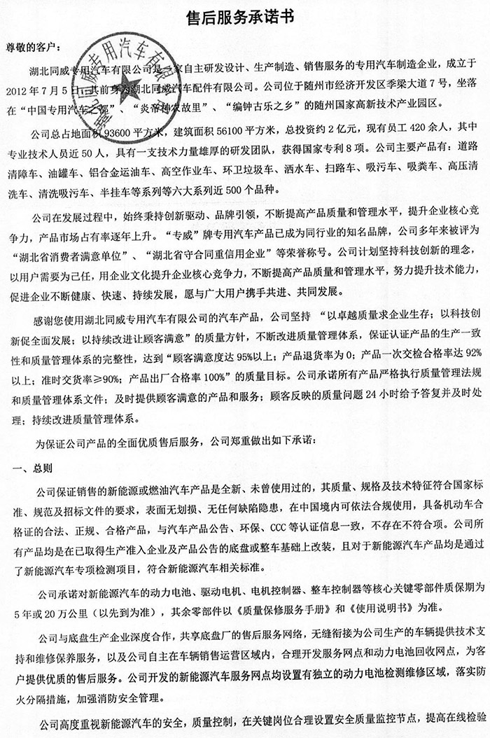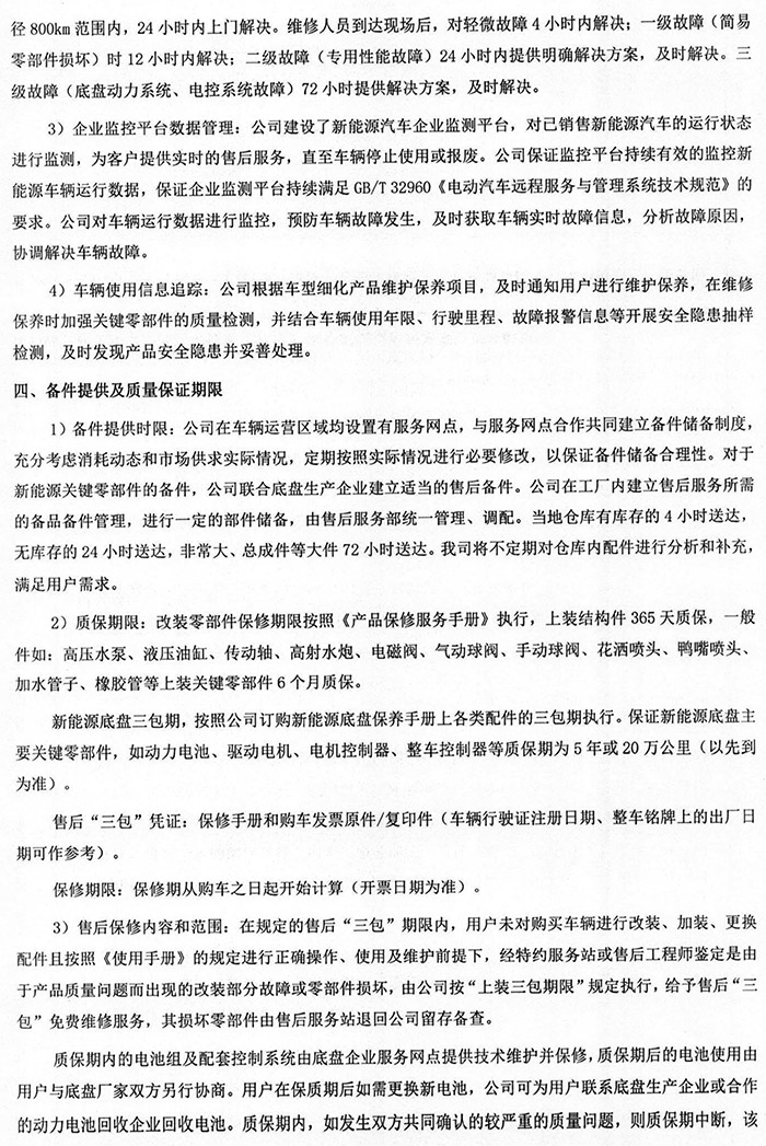 在用戶嚴格遵循使用說明書,正常操作的情況下,自購車之日起(以車輛出廠登記卡為準)一年內,行駛里程不超過 25000公里之內,因設計、制造、裝配原因引起的產品機件損壞,經有關汽車服務站和監督部門鑒定后,在三個工作日內向我公司售后服務部門提交書面資料,售后服務部門確認后實行三包服務。